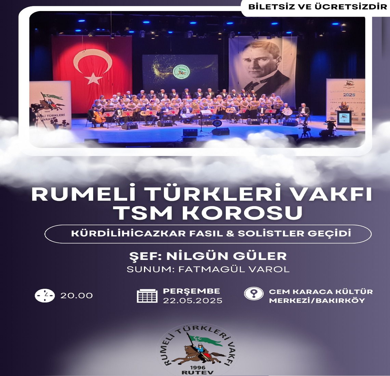 Rumeli Türkleri Vakfı Türk Sanat Müziği Korosu; Sunum Fatmagül Varol, Şef Nilgün Güler yönetiminde “Kürdilihicazkar Fasıl & Solistler Geçidi” Konser’i verecektir.