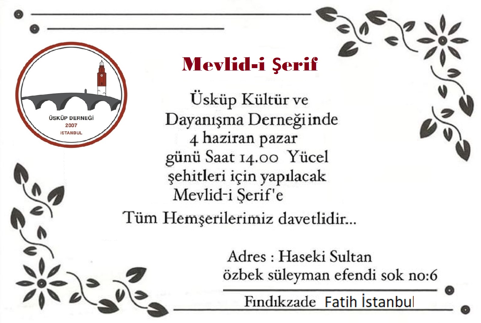 Mevlid-i Şerif Programı;Rumeli Türkleri Vakfımızın Kıymetli Derneği Üsküp Derneği 4 Haziran 2023 Pazar günü Saat 14:00 te Kuzey Makedonya Yücel Şehitleri hasebiyle Üsküp Kültür ve Dayaışma Derneği Merkezi’inde Mevlid-i Şerif ve ...