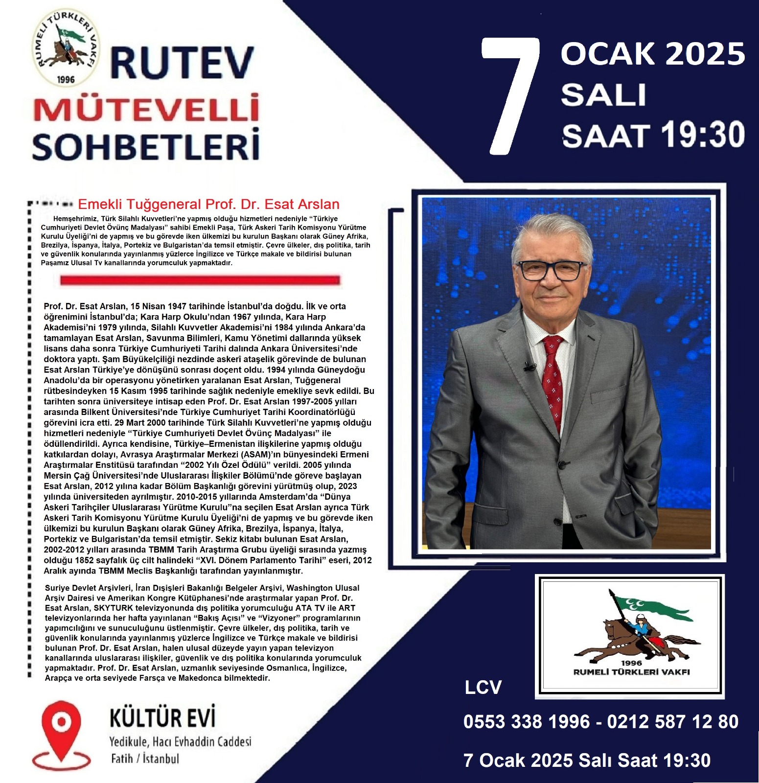 7 Ocak 2025 Salı Günü Saat 19:30 da, Hemşehrimiz Emekli Tuğgeneral Prof. Dr. Esat Arslan Paşamızı Rumeli Türkleri Vakıf Kültür Merkezinde ağırlıyoruz.